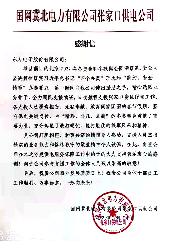截至目前共有股份公司收到来自国网北京市电力公司、国网天津市电力分公司、国网冀北电力有限公司张家口供电公司、国网冀北廊坊供电公司的感谢信;威思顿公司收到来自国网冀北电力有限公司张家口供电公司的感谢信;国网中电公司收到来自国网冀北电力有限公司张家口供电公司的感谢信;玉麟公司收到来自中铁二局集团有限公司的感谢信。